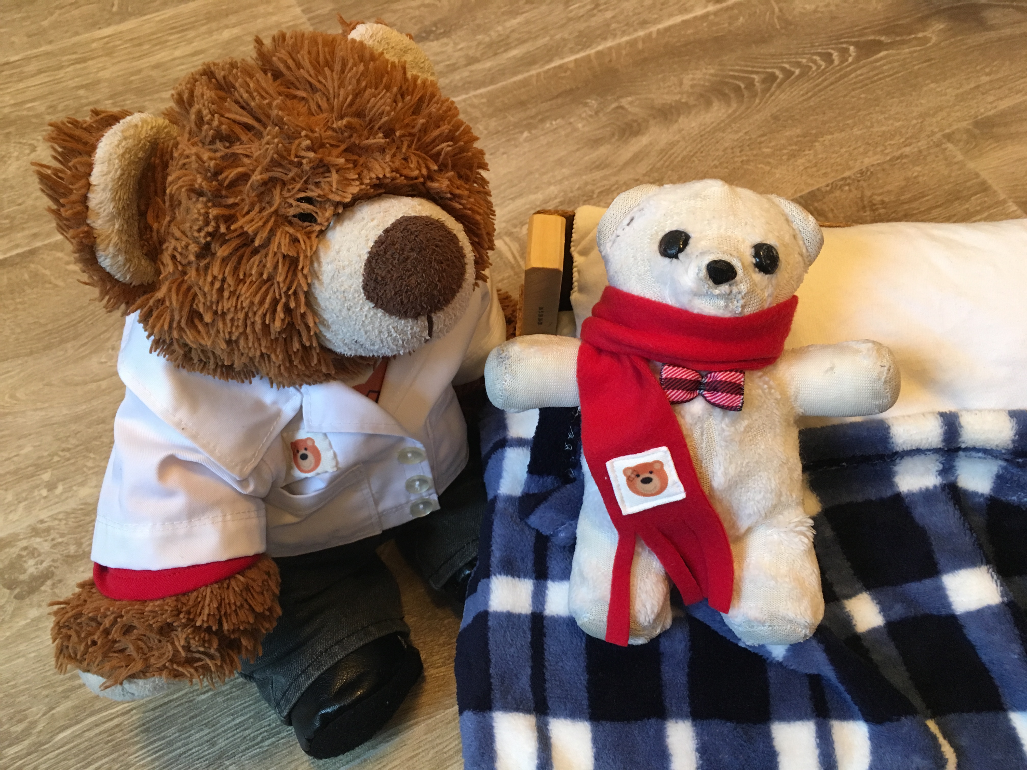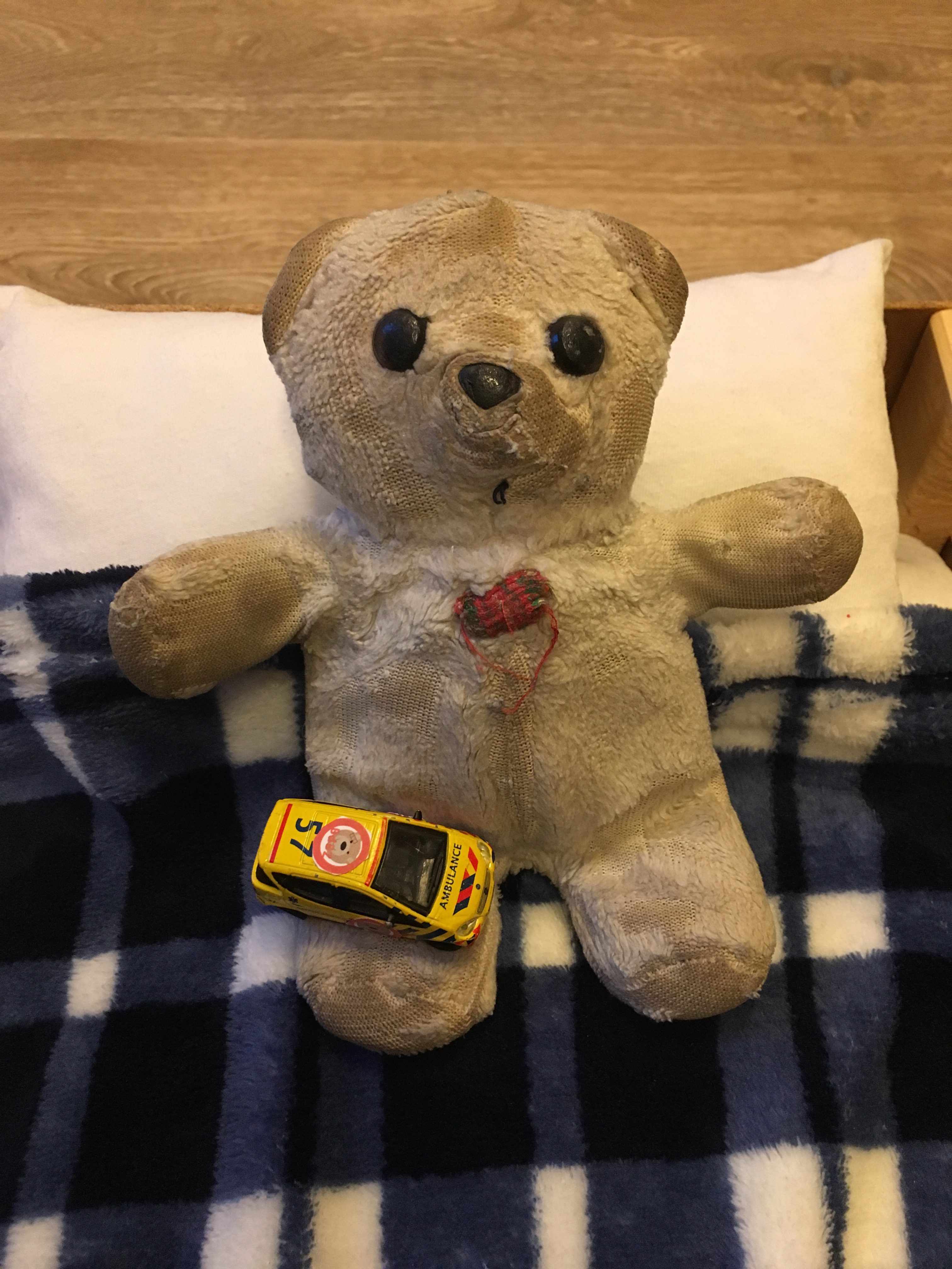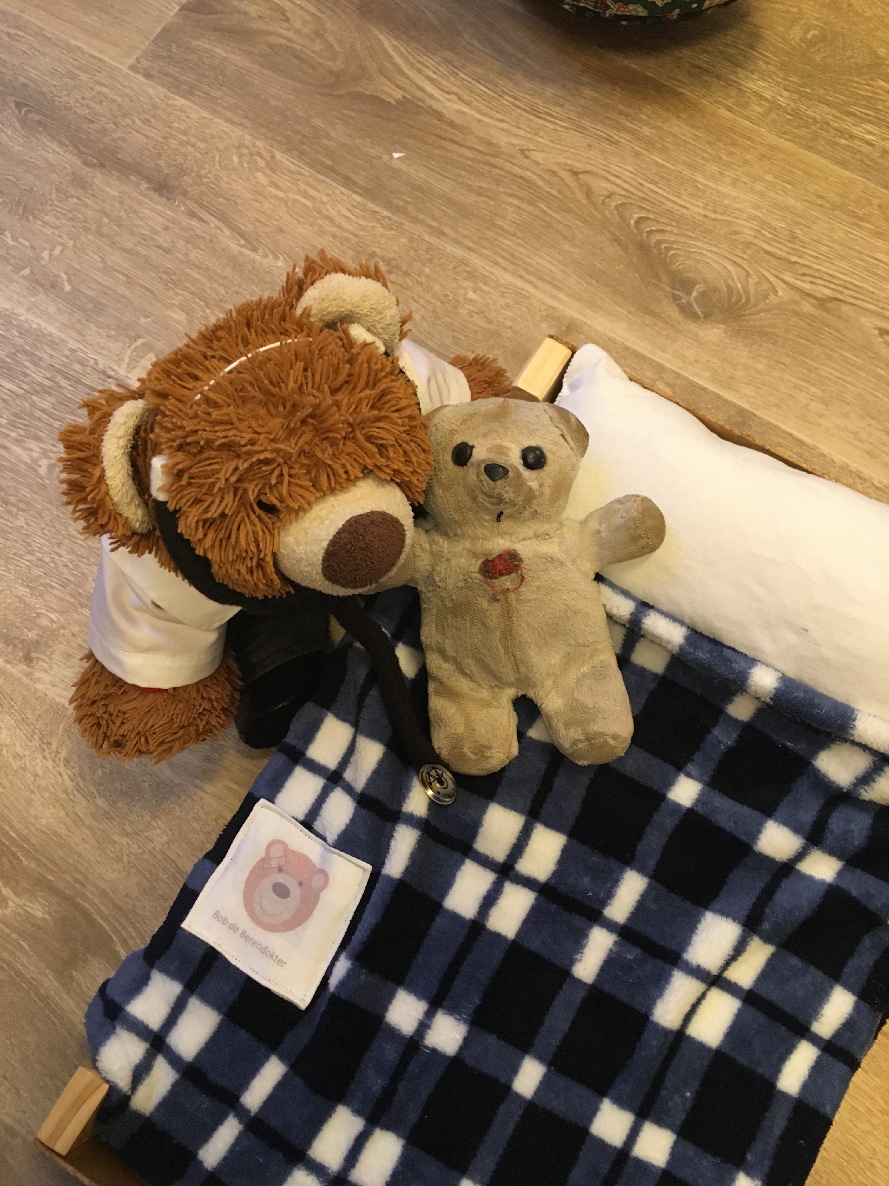 Er is een nieuw kindje onderweg. En zijn/haar vader had nog een lieve oude beer. Deze beer heeft Bob de Berendokter weer opgeknapt. Oude vulling eruit, goed gewassen, binnenkant verstevigd en nieuwe vulling er weer in. Omdat het ruggetje wat kaal geworden was een zacht vestje gemaakt voor Teddy. Nu krijgt Teddy een ereplaatsje in de babykamer!