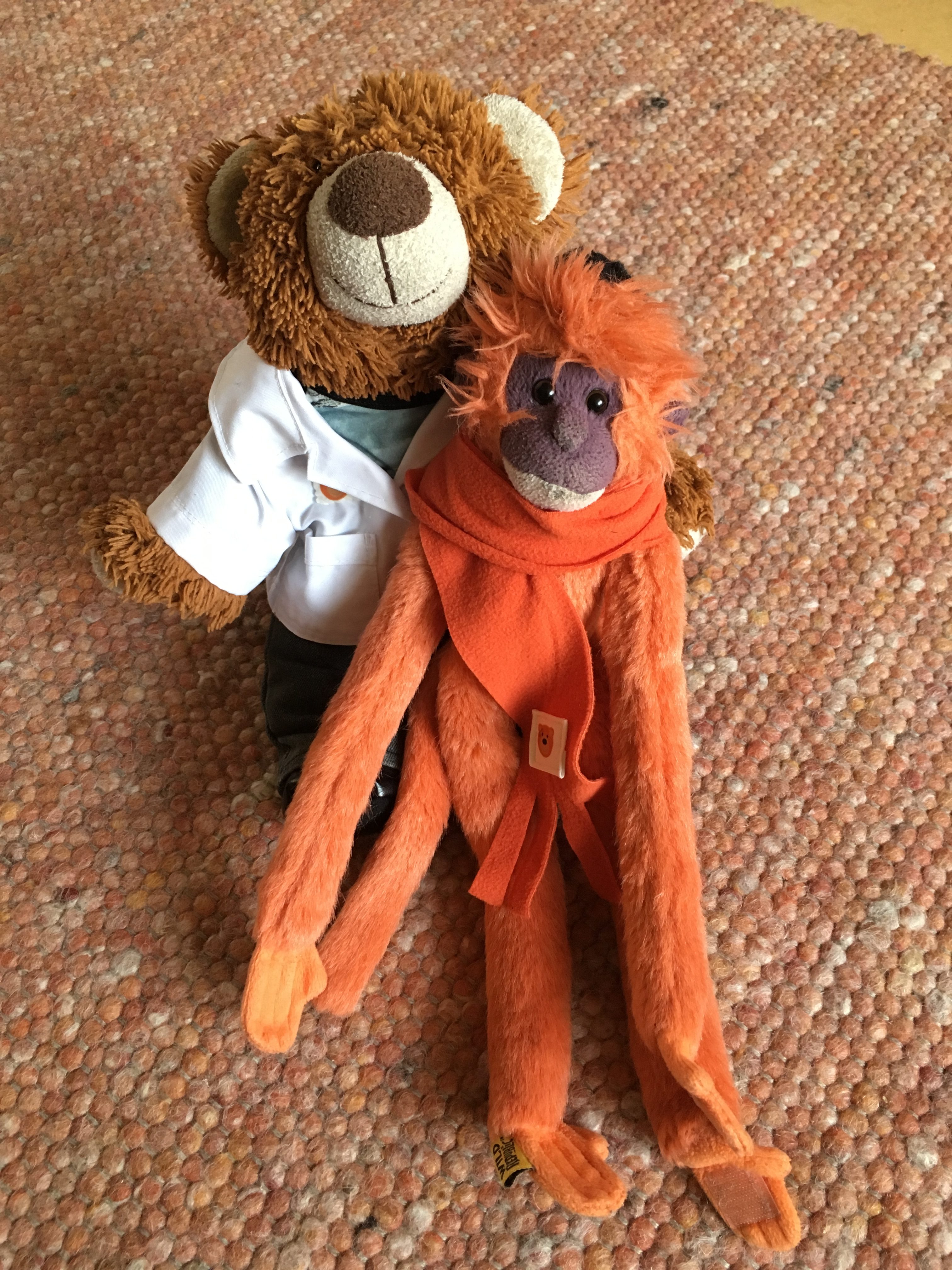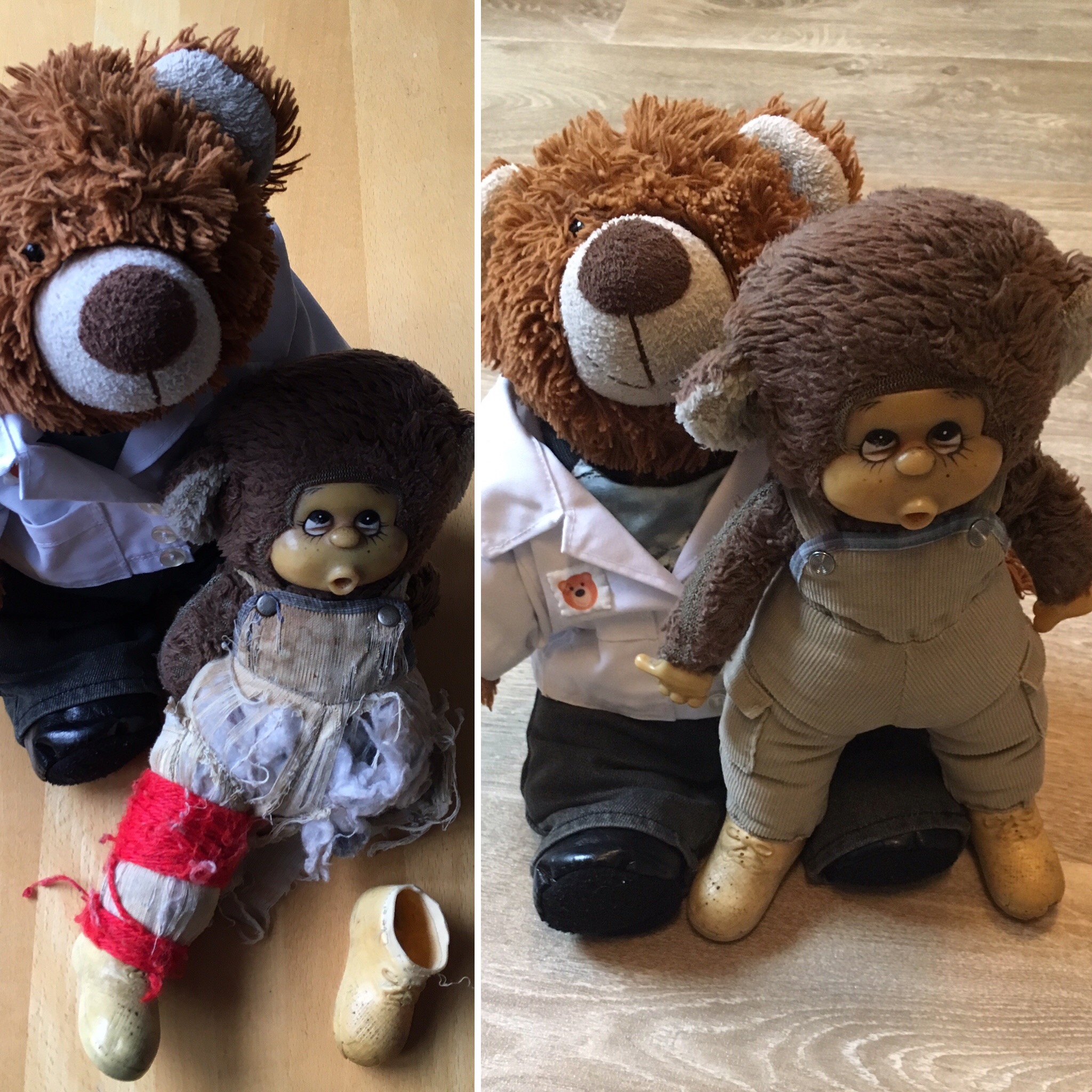 Aai is al jaren zo geknuffeld, dat hij hard en plat geworden was. Ook van zijn strikje was niet veel meer over. Bob de Berendokter heeft de oude, harde fluff eruit gehaald en Aai voorzichtig gewassen. Aai bleek wit te zijn! Toen weer nieuwe, zachte fluff erin, gaatjes gerepareerd en een nieuw strikje gemaakt. Aai kan weer jaren mee gaan!