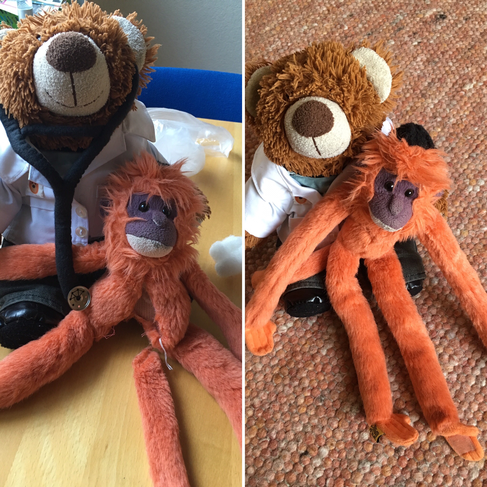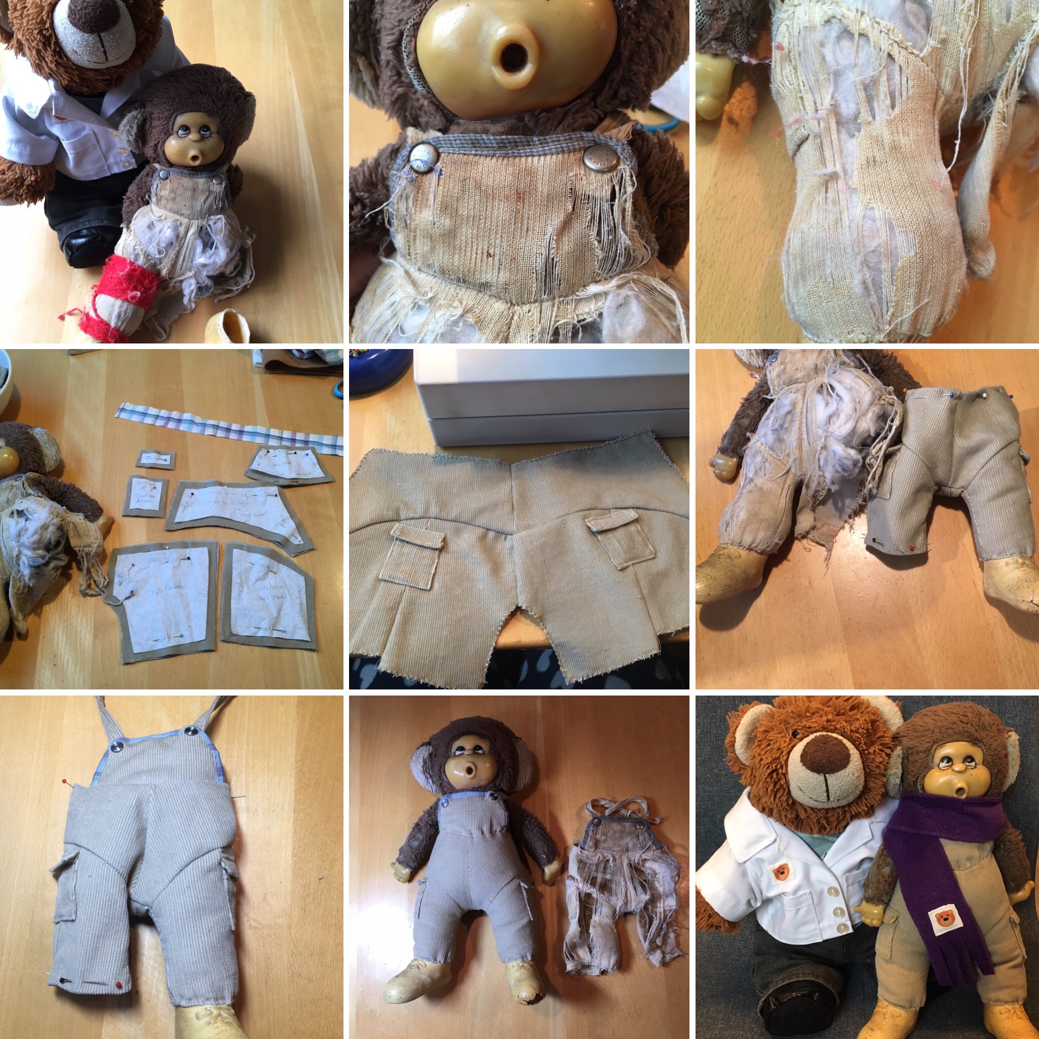 Een groot deel van het lijf van Monkie bestond uit een broek. Deze is in de loop van de afgelopen 40 jaar aardig versleten. Bob de Berendokter heeft daarom een nieuwe broek voor haar gemaakt. Nu kan Monkie weer flink wat jaren mee!